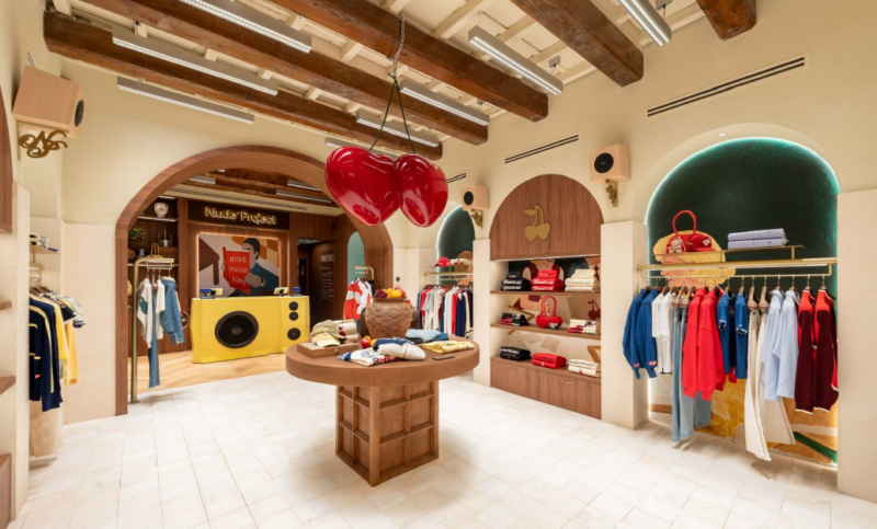 L’ambiente è un’opera d’arte immersiva: le pareti sono state dipinte a mano in dieci giorni dall’artista Mago Dovjenko, mentre all’ingresso spiccano iconiche ciliegie oversized retro-illuminate. All’interno, ogni dettaglio è pensato per favorire il dialogo: dalle aree relax con tavoli da backgammon fino all’inedita “Wine Experience”. Grazie a un dispenser integrato, i membri della community possono godersi un bicchiere di vino semplicemente scansionando la propria membership, trasformando lo shopping in un momento di ospitalità e convivialità.