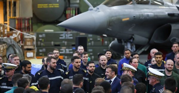 Ancora un immagine di Macron tra i marinai della Charles de Gaulle, di fronte a un caccia Rafale, il 9 marzo scorso (Gonzalo Fuentes/Pool Photo via AP).