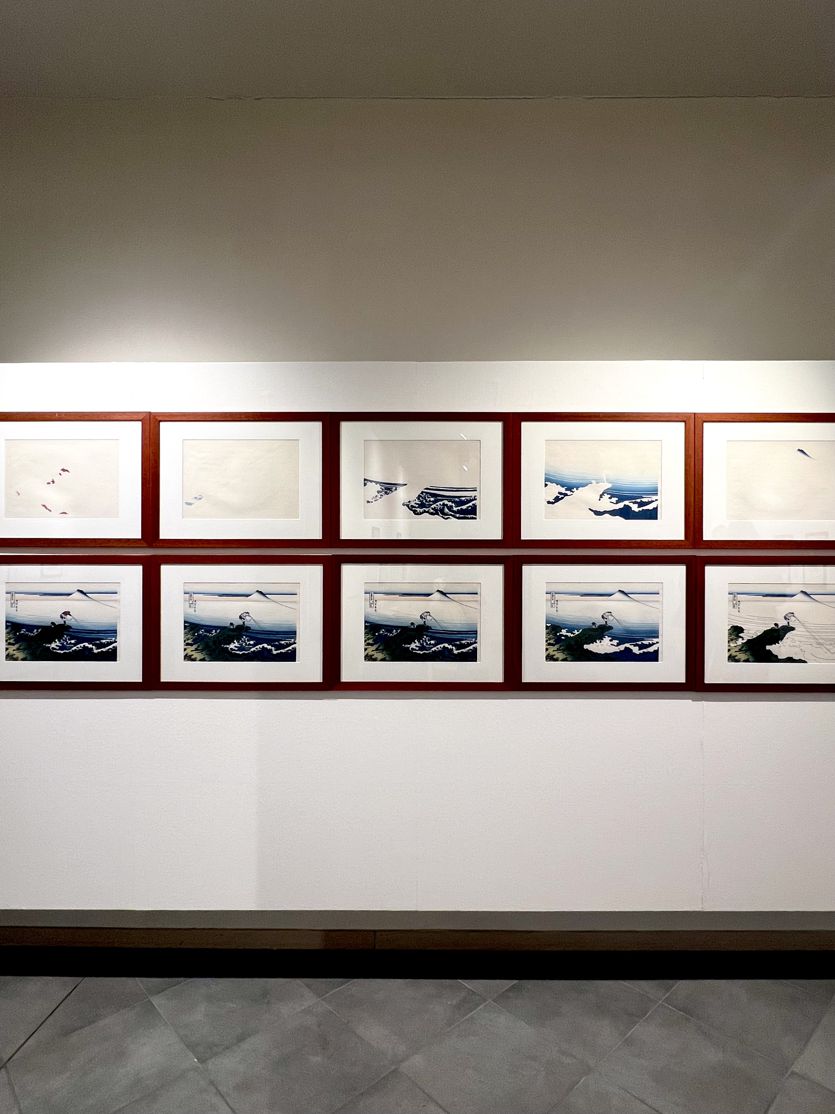 Katsushika Hokusai, attivo tra la fine del Settecento e la prima metà dell’Ottocento, è uno dei principali esponenti dell’ukiyo-e, espressione che indica una visione della vita legata al presente, fatta di momenti vivaci e transitori. Pittore e incisore, ha lasciato un corpus ampio di opere. Le sue xilografie nascono da un processo preciso: l’artista progetta, l’incisore traduce il segno sul legno, lo stampatore costruisce l’immagine attraverso passaggi successivi di colore. In questo sistema, Hokusai introduce il bokashi, una tecnica di sfumatura che consente passaggi graduali di colore dando più profondità a cielo e acqua. La serie delle Trentasei vedute del Monte Fuji resta il suo lavoro più rappresentativo. Il percorso mette in evidenza una ricerca continua, segnata da spostamenti assidui, cambi di nome e da una costante ricerca quasi ossessiva verso una resa formale sempre più precisa. Il suo lavoro raggiunge anche l’Europa e trova riscontro nella pittura dell’Ottocento, con effetti visibili nel lavoro di Vincent van Gogh, Claude Monet e Edgar Degas. Un passaggio rilevante riguarda l’introduzione della prospettiva occidentale, conosciuta attraverso stampe e modelli europei diffusi in Giappone tramite i commerci olandesi. Questo metodo consente di organizzare con maggiore precisione il rapporto tra primo piano e sfondo. sfidando gli schemi iconici giapponesi che si basavano sulla prospettiva gerarchica dove la grandezza delle figure riflette la loro importanza. A questa fase si lega anche l’uso del Blu di Prussia, introdotto anch’esso in Giappone a partire dagli anni Venti dell’Ottocento. Un pigmento di produzione industriale che risulta essere più stabile e intenso rispetto ai colori naturali ampliando le possibilità espressive e consentendo una resa più profonda e volumetrica delle superfici, in particolare dell’acqua.