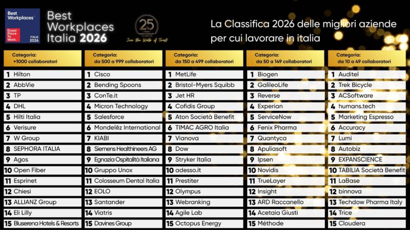 Tra le aziende con oltre mille collaboratori, il primo posto va a Hilton, seguita da AbbVie e Teleperformance. Nella categoria 500-999 dipendenti si impone Cisco, davanti a Bending Spoons e ConTe.it.